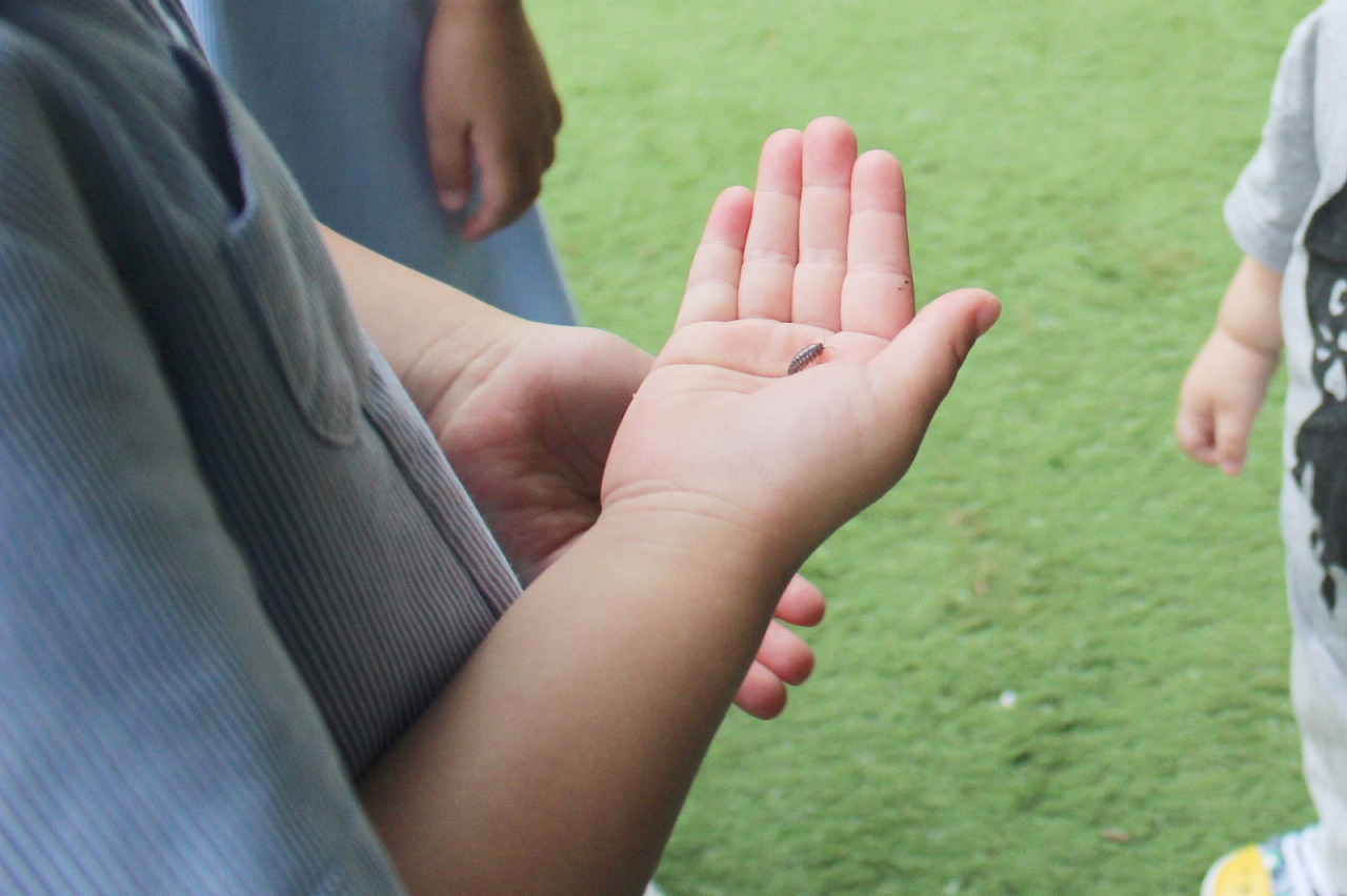 パール幼稚園のお友だちが葉っぱや手の上になにやら乗せています。