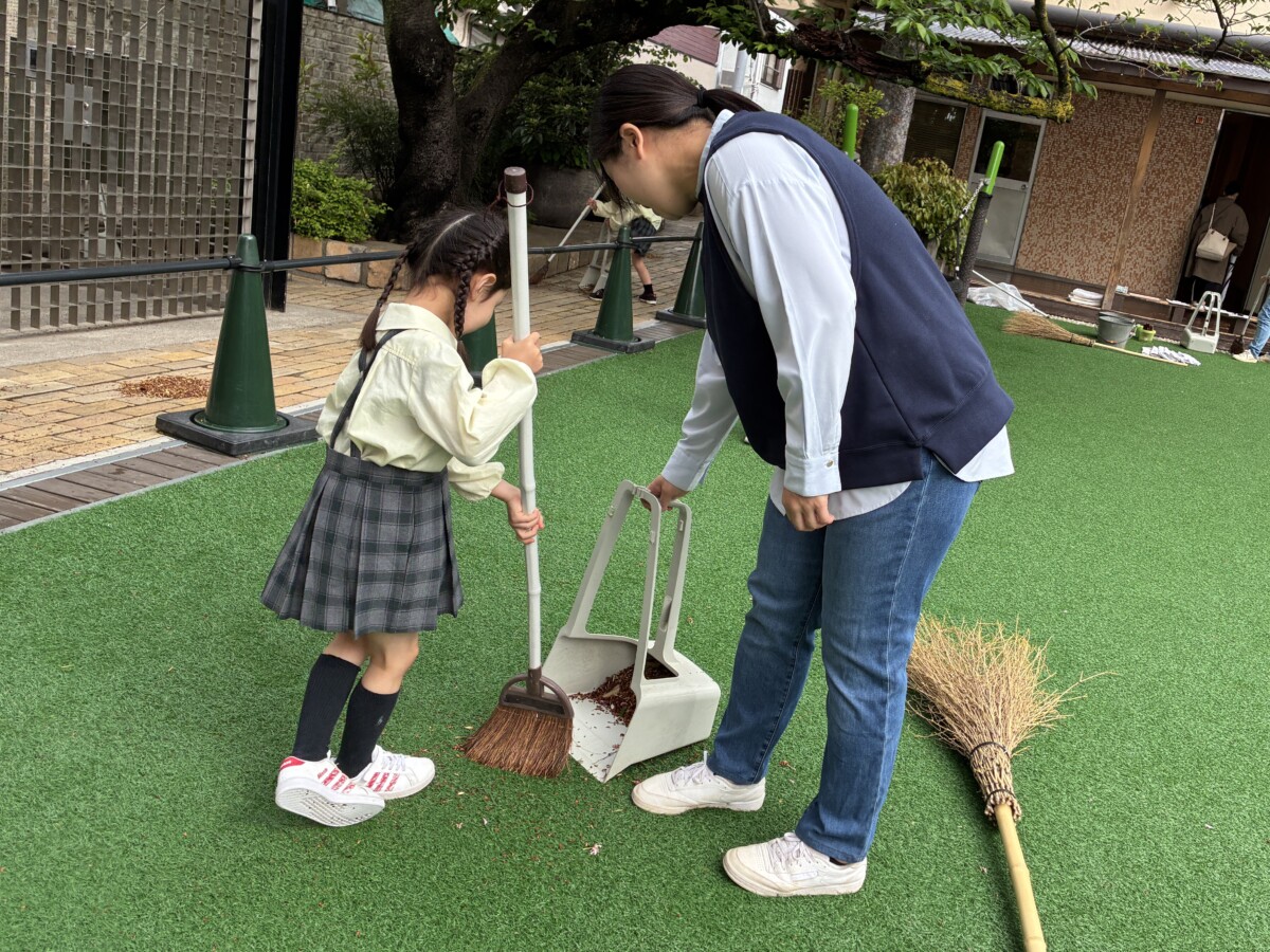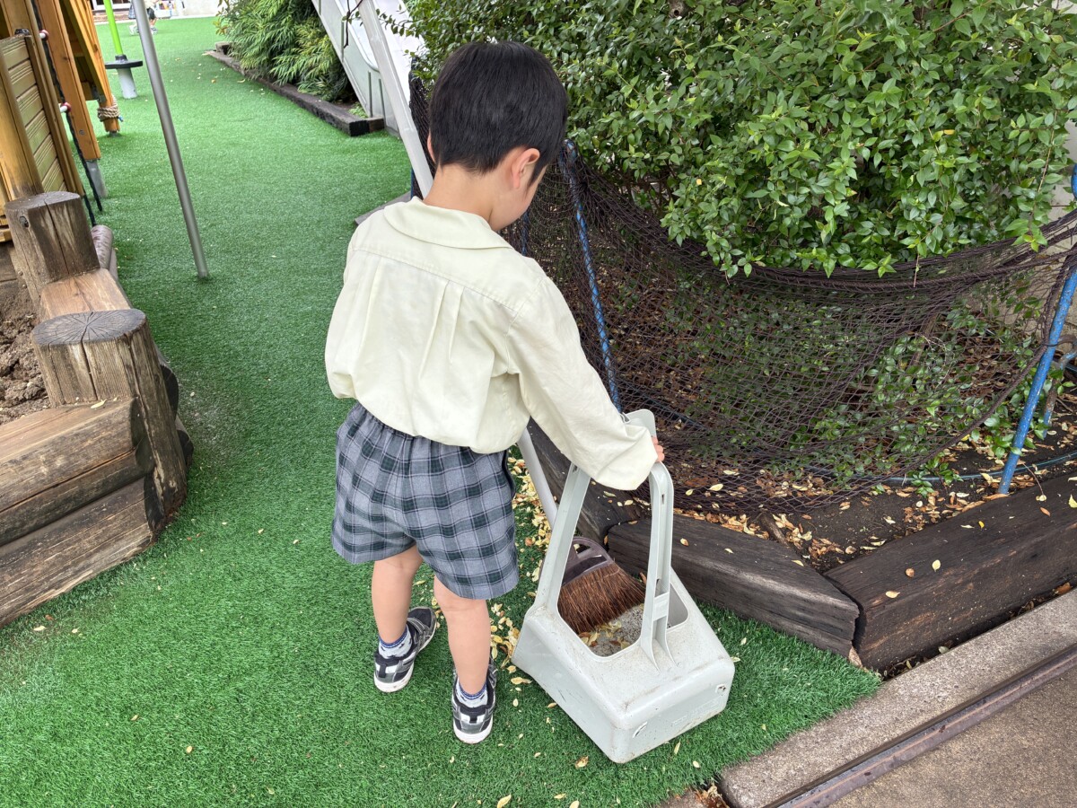 先生たちが掃除をしている姿を見ると、ほうきやちりとりを持ち、先生の姿を真似しながら落ちている葉っぱを拾ってくれていました。